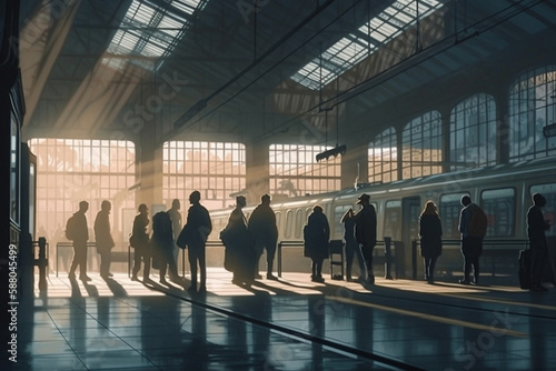 Illustration of a busy train station with people waiting for their train to arrive. Ai generated.