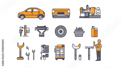 Illustration of a car and various auto mechanic tools and equipment on a white background