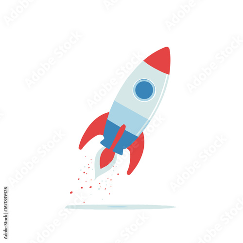 Illustration of a cartoon rocket ship launching with red and blue accents against a white background