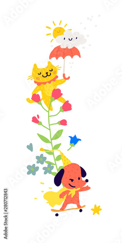 Illustration of a cat with an umbrella and dogs on a skateboard. Animals among the flowers. Children's cartoon, doodle style. Illustration for kindergarten or club. Institutions for children.