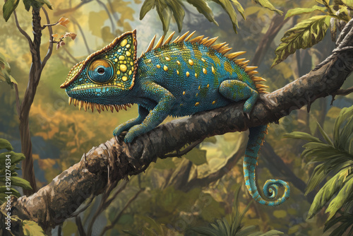 Illustration of a colorful chameleon perched on a twisted jungle branch, its scales shifting hues from deep green to bright blue. The detailed texture of its skin, its curling tail, and the curious