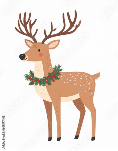 Illustration of a Cute Brown Deer with Antlers and Christmas Wreath on White