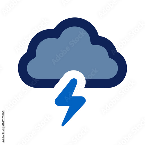 Illustration of a dark blue cloud with a blue lightning bolt on a white background weather graphic