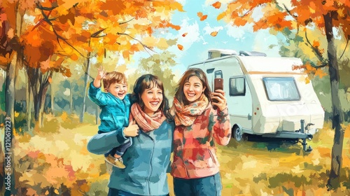 Illustration of a family (two women and a young child) taking a selfie during a fall camping trip, with bright orange leaves and a RV in the background.