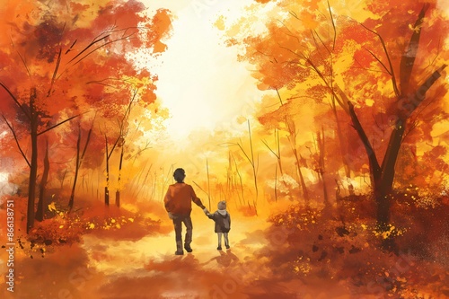 Illustration of a father and child holding hands walking down a path in a forest filled with colorful autumn leaves