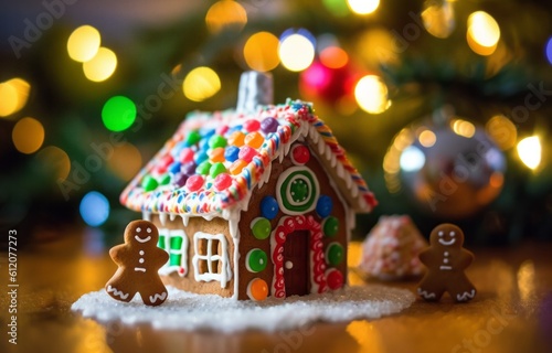 Illustration of a festive gingerbread house on a decorated table created with Generative AI technology