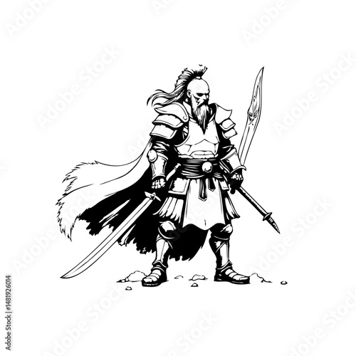 Illustration of a Fierce Warrior Armed with Swords Standing Stoically in Defense