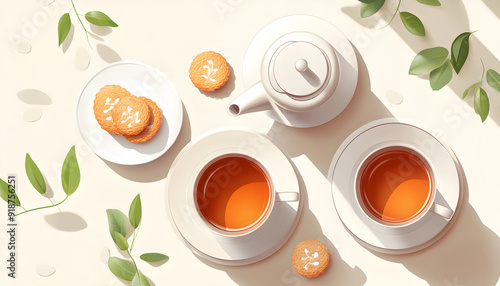 Illustration of a flat lay showing a tea time setup with a teapot, cups, and cookies, viewed from above with space for text
