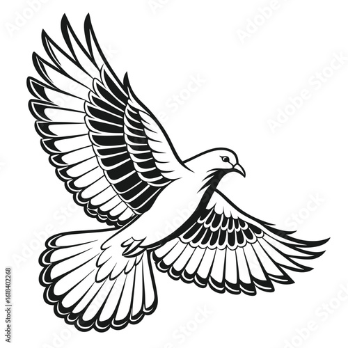 Illustration of a flying dove bird with spread wings in black and white outline style isolated on white background