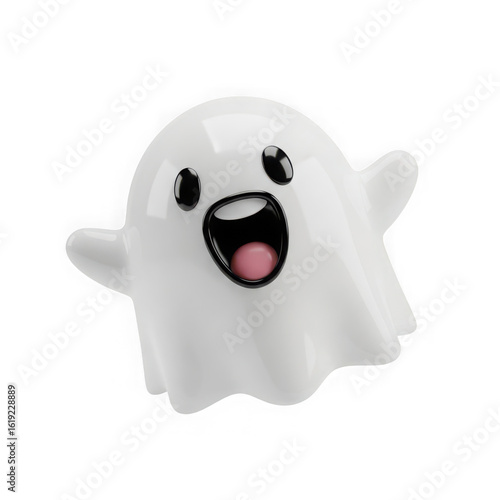 Illustration of a friendly ghost with a big open mouth and a pink tongue floats on a transparent background