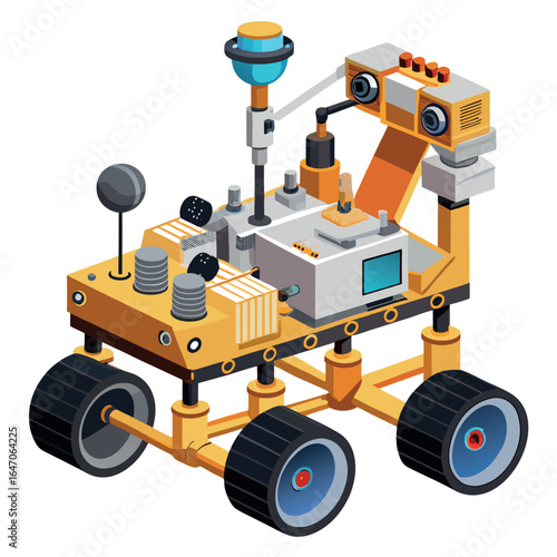 Illustration of a futuristic yellow space exploration rover with wheels, cameras, and antennas, isolated on white background