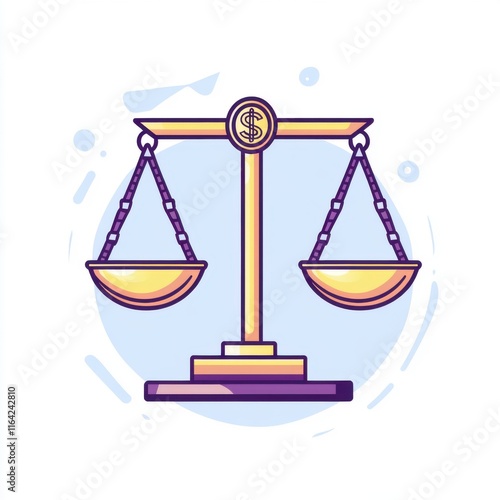 Illustration of a golden balance scale with dollar signs symbolizing justice and finance.