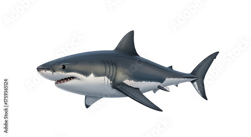 Illustration of a great white shark swimming with its mouth slightly open on a black background created with generated ai