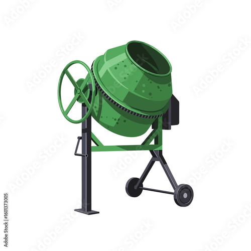 Illustration of a green cement mixer with a wheel for tilting, standing on a white background.