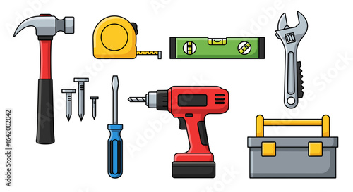 Illustration of a hammer, tape measure, level, wrench, drill, screwdriver, nails, and toolbox
