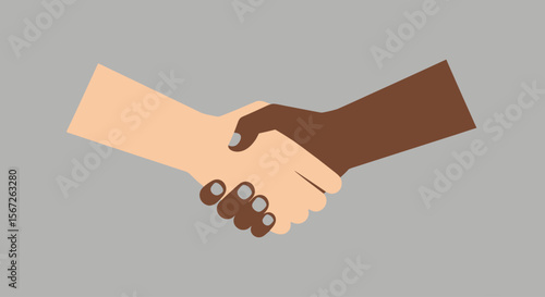 Illustration of a handshake between a light-skinned hand and a dark-skinned hand against a gray background.