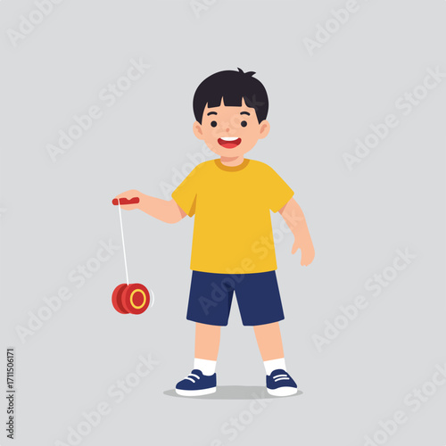 Illustration of a happy young boy playing with a red and yellow yo-yo on a gray background