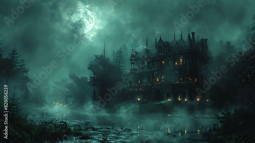 illustration of a haunted mansion shrouded in mist with creaking floorboards flickering candlelight and ghostly apparitions haunting the halls on a moonlit night