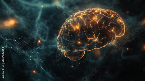 Illustration of a human brain with neural connections highlighted in a cosmic background