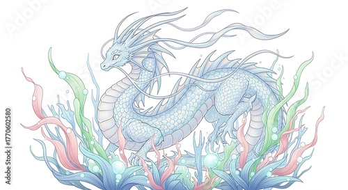 Illustration of a light blue dragon surrounded by colorful seaweed.