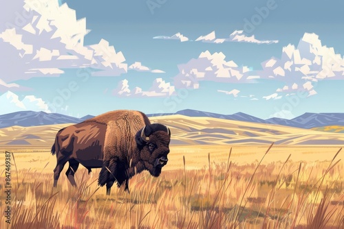 Illustration of a majestic bison strolling through a golden prairie with mountains and a vibrant sky in the background.