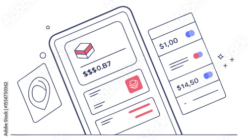 Illustration of a mobile phone displaying a financial application interface with various data points