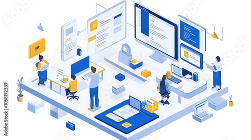 Illustration of a Modern Office Workspace with People Working on Computers
