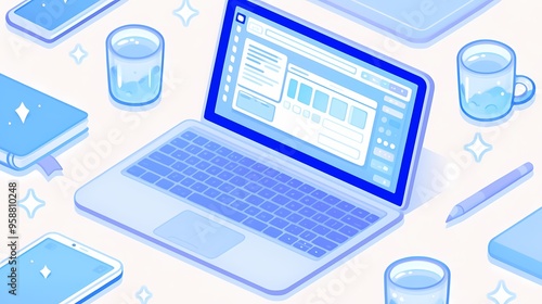 Illustration of a modern workspace with a laptop and office supplies in blue tones.