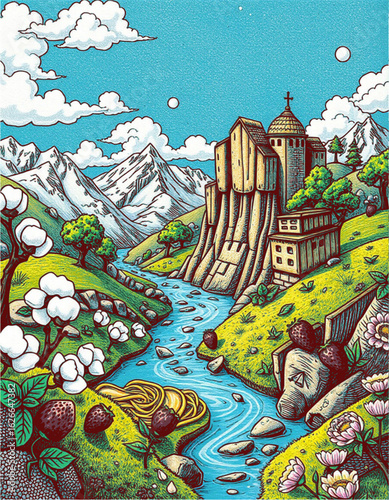 Illustration of a mountain landscape with a river, building, and strawberries in the foreground