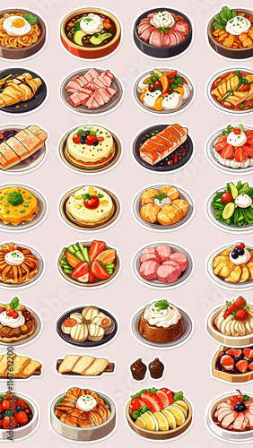 Illustration of a perfect meal with rice, beef, salad, egg, shrimp, and soup presented on a plate and bowl