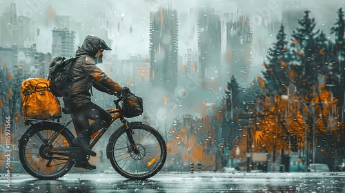Illustration of a person in a yellow jacket cycling along a city street, surrounded by falling autumn leaves and blooming flowers.