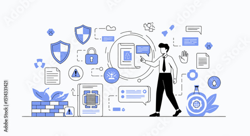 Illustration of a person interacting with various digital security and data protection icons in a networked environment