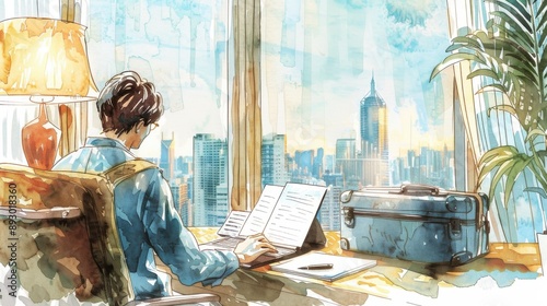 Illustration of a person reading a book by a window, overlooking a cityscape, with a suitcase and lamp on a desk.