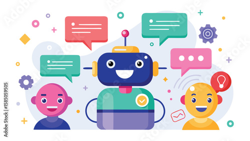 Illustration of a robot surrounded by speech bubbles and two human faces in a colorful and playful style