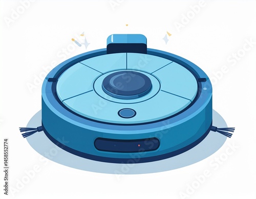 Illustration of a robotic vacuum cleaner with a light blue body, featuring a circular design and a button