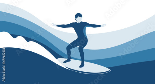 Illustration of a surfer riding a wave in the ocean with a minimalist style
