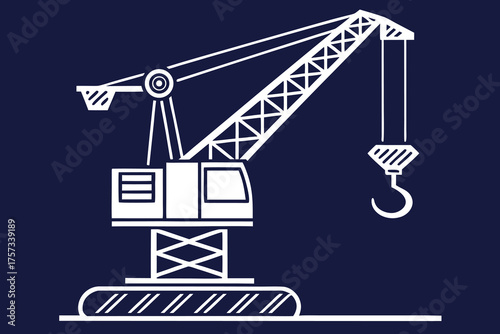 Illustration of a white crane with a hook and a boom on a dark blue background in a minimalist style