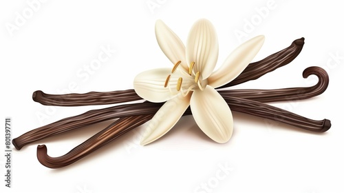 Illustration of a white vanilla flower and several dark brown vanilla pods on a white background.