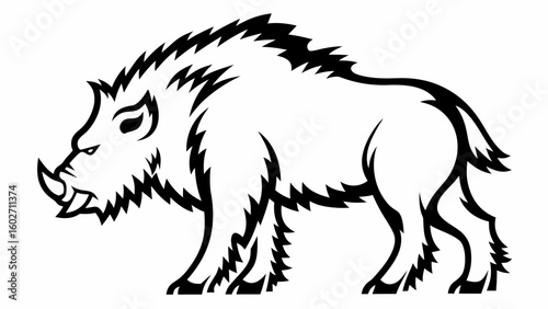 Illustration of a wild boar with tusks and spiky fur in black and white outline style design vector