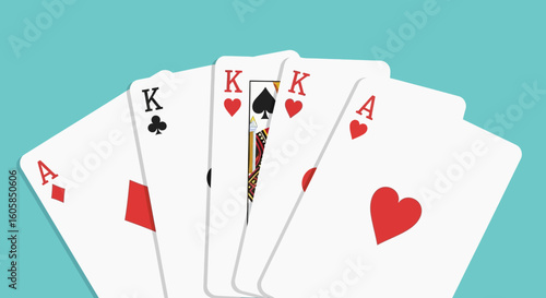 Illustration of a Winning Poker Hand Full House Combination of Kings and Aces on a light Blue Background