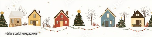 Illustration of a winter street with cute houses, trees and lights in snow, a snowman, and flat buildings on a white background.