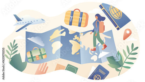 Illustration of a woman traveler with a backpack and a map with travel related items around