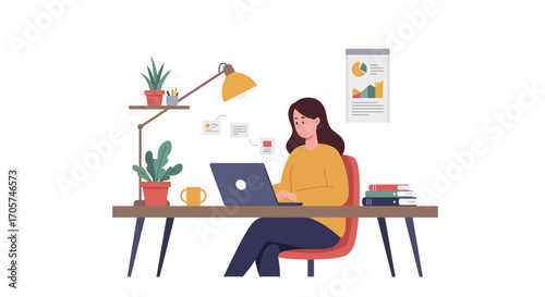 Illustration of a woman working at a desk with laptop, plants and charts in a home office setup. Concept for remote work, online education and freelance lifestyle