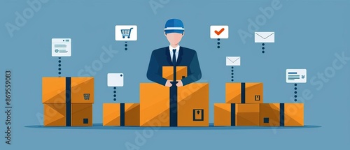 Illustration of a worker handling packages with delivery icons. Concept of shipping, logistics, and package management.