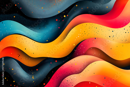 illustration of abstract shapes and patterns, featuring flowing curves, diagonal lines, and overlapping shapes in bright, contrasting colors. The design has a dynamic and energetic feel.
