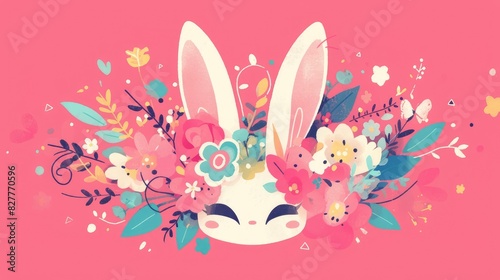 Illustration of an Easter mask adorned with cute rabbit ears on a delightful pink backdrop accented with floral elements