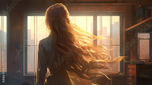 illustration of back view portrait, a pretty woman in room at evening time with sunlight, Generative Ai