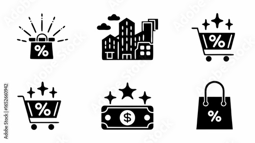 Illustration of black shopping icons including discount bags, city, cart, and money symbols | editable eps vectors silhouette