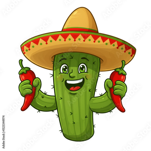 Illustration of Cheerful Cactus Wearing Sombrero Holding Red Chili Peppers