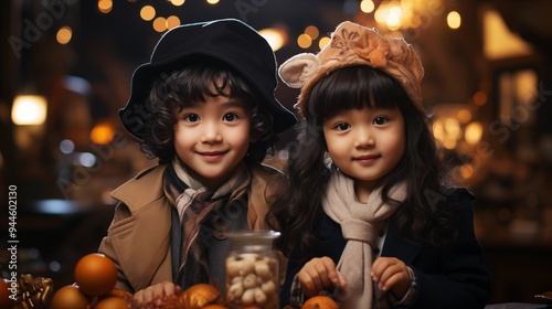 illustration of cheerful children in Christmas hat surrounded by decorative details and looking at camera in blurred background